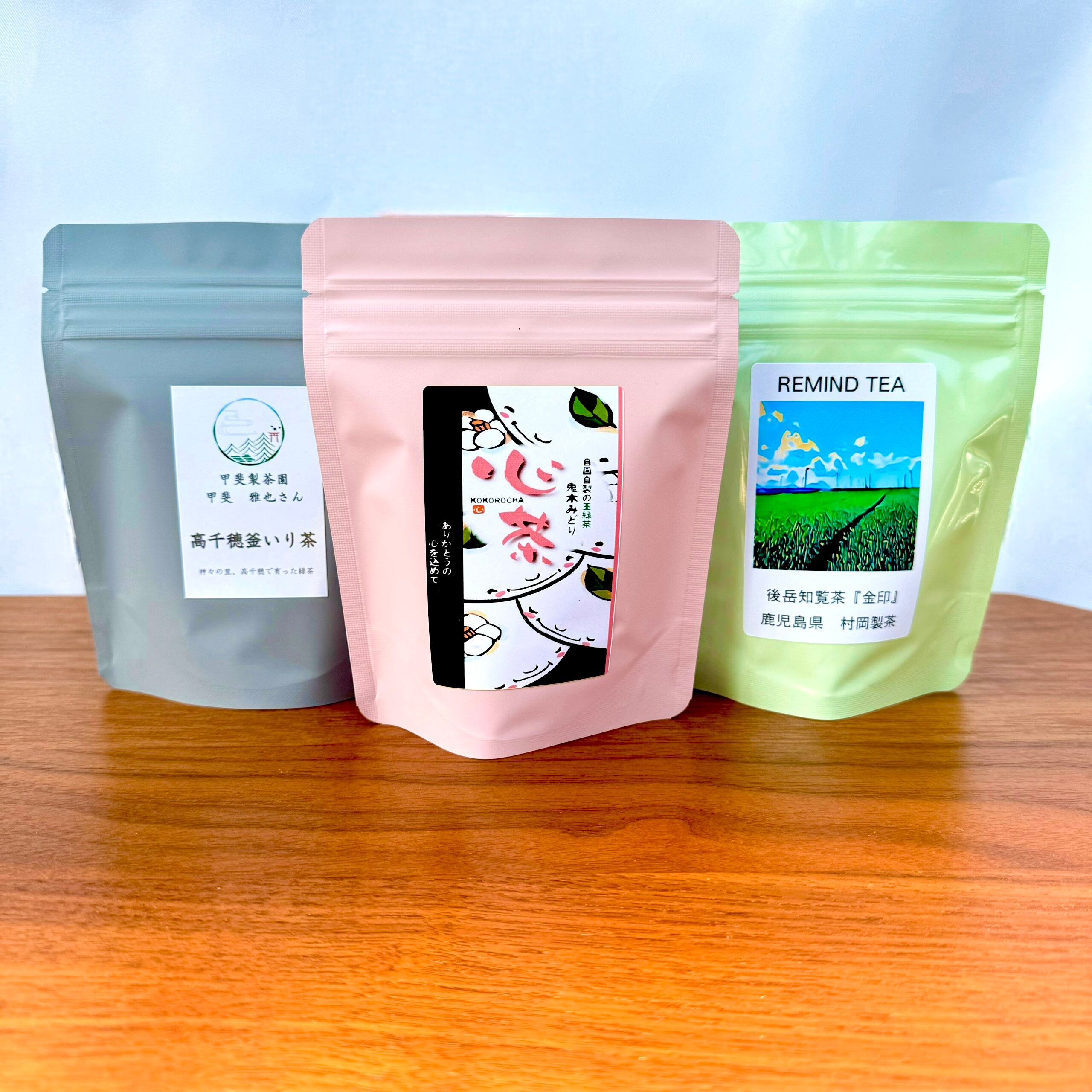 高級緑茶リーフのセット商品(玉緑茶、深蒸し茶、釜炒り茶)、3種とも全く味わいが違います。どのお茶も素晴らしい品質で、各農家さんの「最高の一品」を十分に楽しめます。